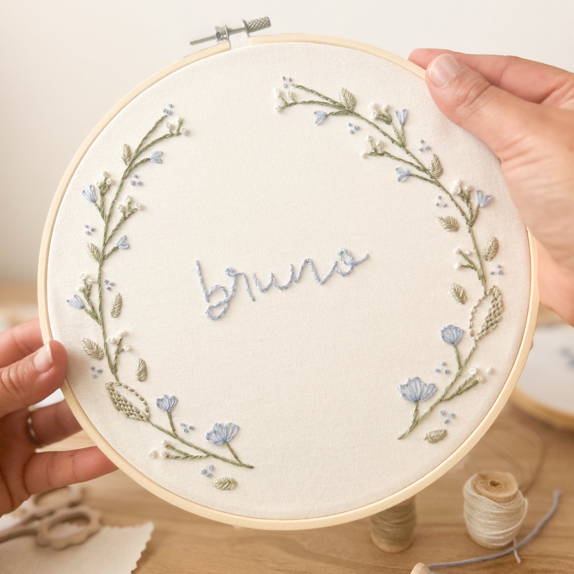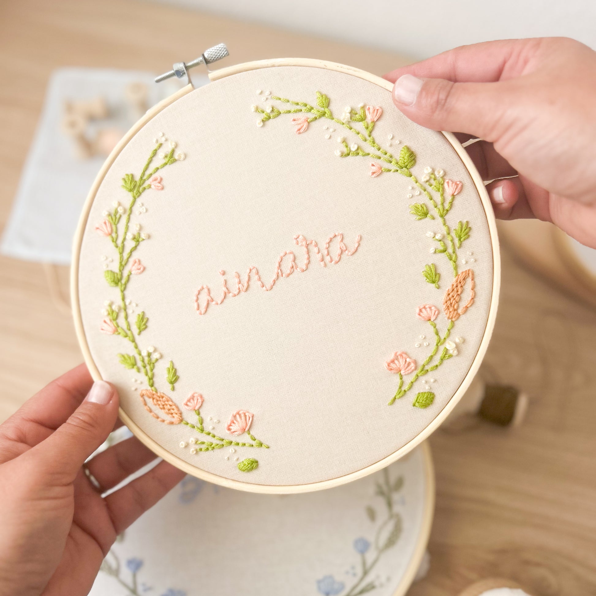 Se trata de un bastidor de bambú de 20 cm. con diseño de rosas, ramitas, hojas y nombre personalizado bordado a mano en 4 colores, sobre lienzo.